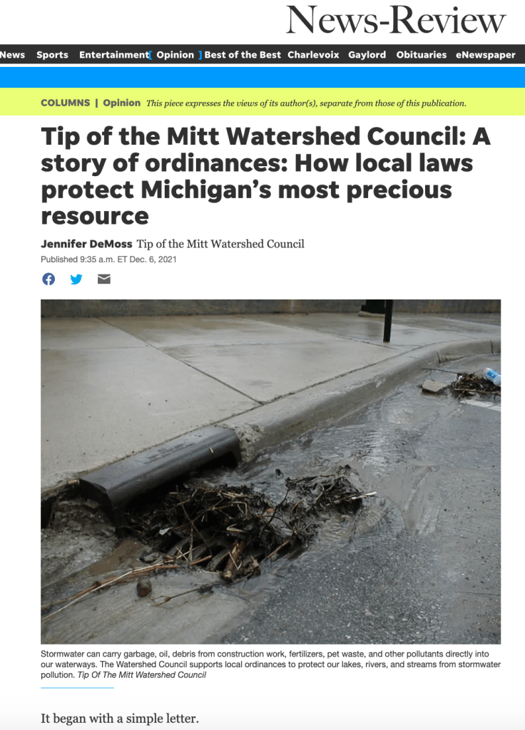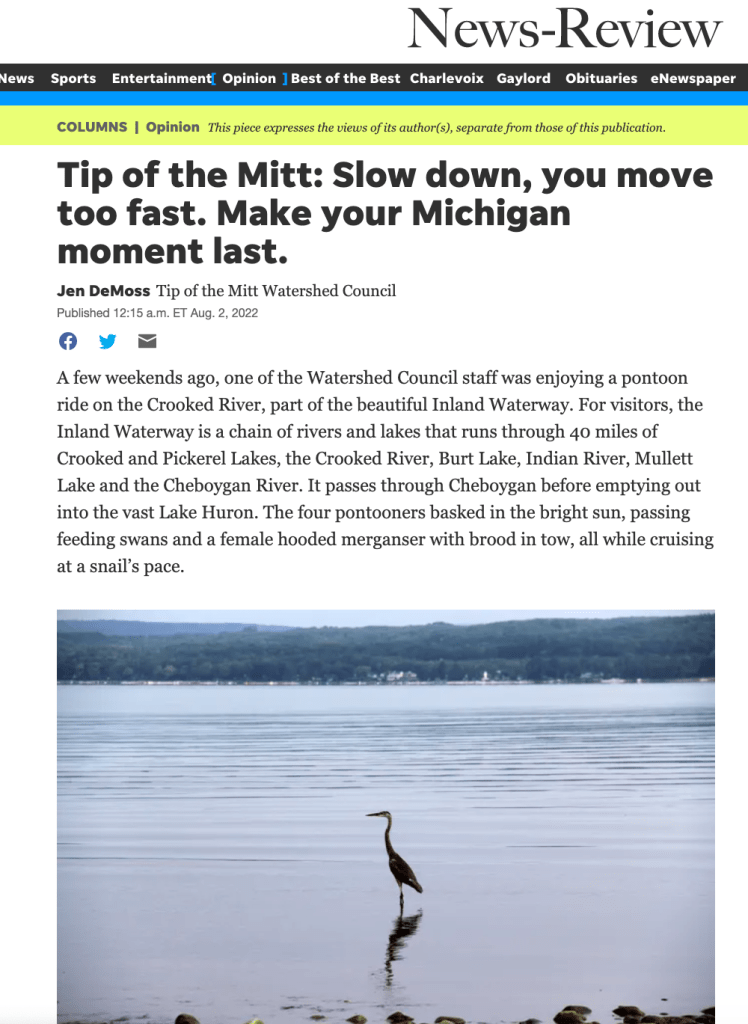Tip of the Mitt Watershed Council’s column in the Petoskey News-Review was a fantastic space to showcase the org’s efforts to protect the area’s freshwater resources, and to ask readers to join us. You can see in this piece how I start off with a story to place readers inside the action and help them relate to the importance of no-wake zones.