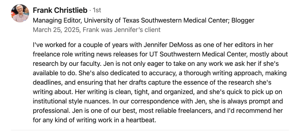 As a scientist, I love sharing how researchers and clinicians are working to improve human health. If you need help distilling complex medical language into compelling, digestible pieces for your audiences, I’m your storyteller. Just hit “Get in Touch” to get the conversation started.
